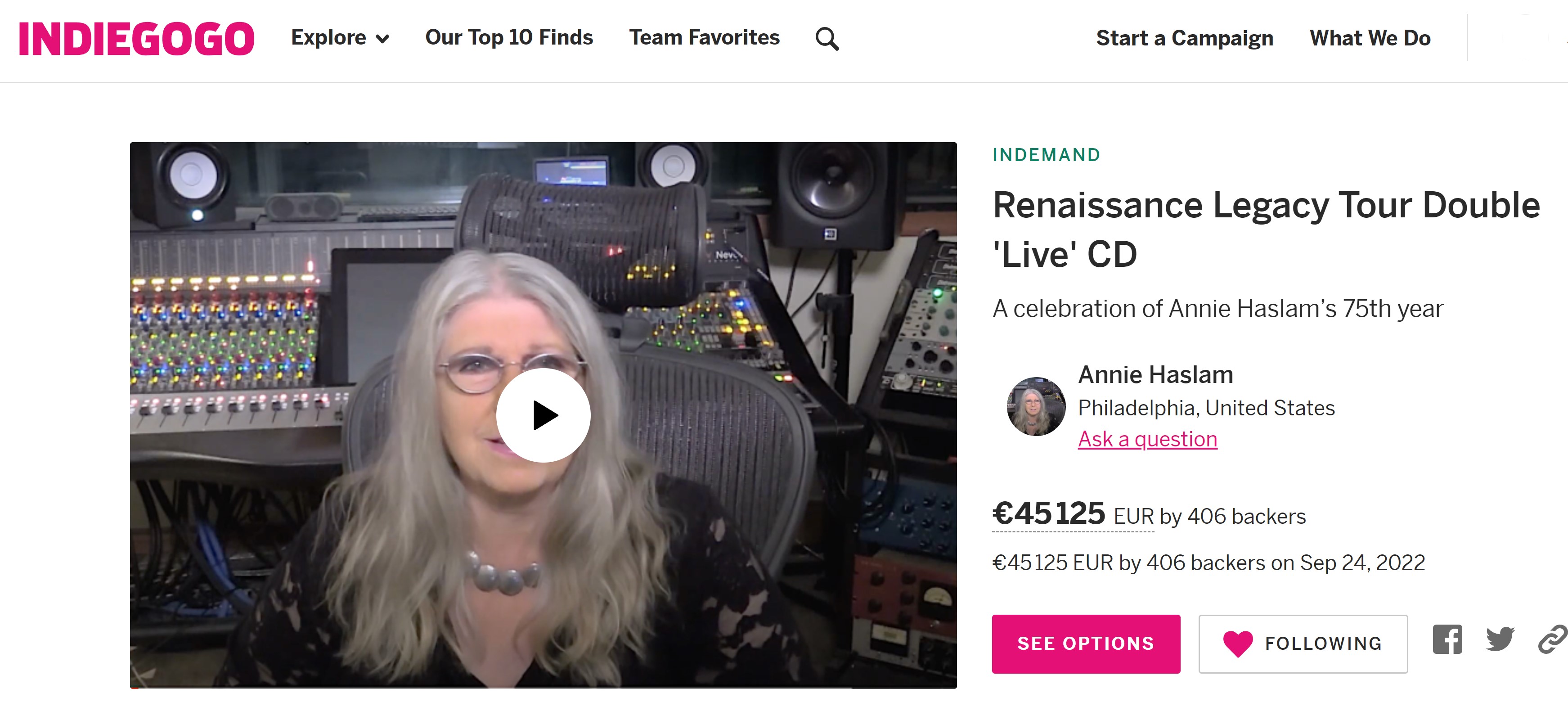 Annie Haslam, ayant fêté ses 75 ans, en vient à ce qui sera peut-être la dernière tournée de Renaissance : sept concerts au mois d'octobre sur la côte Est des USA. Le groupe sera accompagné d'un orchestre classique de 12 musiciens et interprétera non seulement des titres de Renaissance mais aussi quelques-uns du répertoire solo d'Annie Haslam. Cette tournée donnera lieu à la production d'un double album live, soutenue par une campagne de financement participatif qui vient tout juste de se terminer et qui a largement dépassé le but annoncé, qui était d'un peu plus de 38000 Euros.