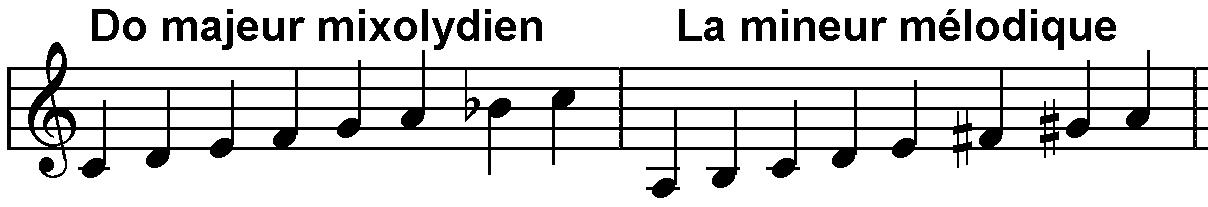 La seconde section (0:41-1:08) doit nous apporter un plus de lumière, mais en douceur et donc évoluer sur le plan harmonique vers le mode majeur le plus proche de La mineur: Do majeur. Nous ne sommes cependant pas arrivés à destination et la tension présente dans ce mode majeur est trop forte, seule sa couleur nous importe. Ici le 7ème degré (si) se trouve à 1/2 ton de la tonique (do), il devrait garder ses distances, on le bémolise donc. En introduisant le "sib" dans la gamme de Do majeur on crée le mode de Do myxolidien. Ici la mélodie est centrée sur la tierce, on souligne mieux la tonalité que précédemment.
